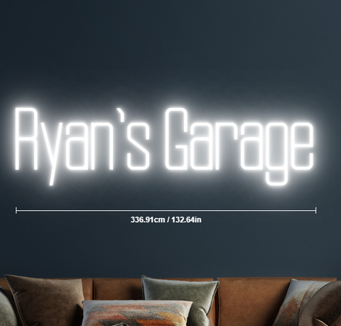 "Ryan's Garage": A rugged, industrial neon sign that could be used to advertise an automotive repair shop.