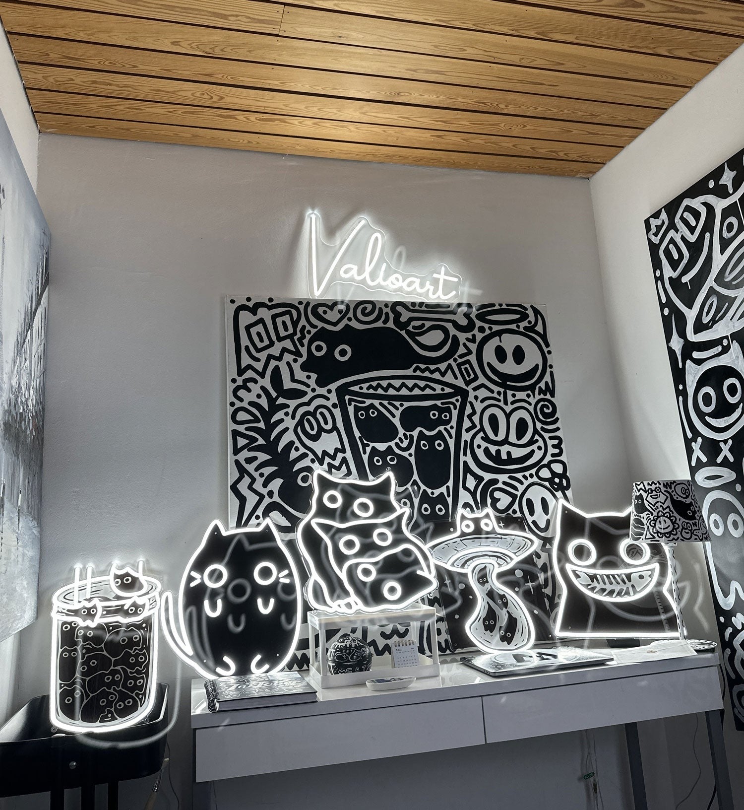 We've partnered with the illustrative genius of ValioArt to bring to life his irresistibly cute feline creations as radiant neon signs. Whether it's a laughing fishbone-engrossed cat or mischievous kittens peeping through a bucket, each piece is a beautiful amalgamation of artistry and luminous charm. Dive into this delightful collection and brighten your spaces with these adorable glowing feline wonders.